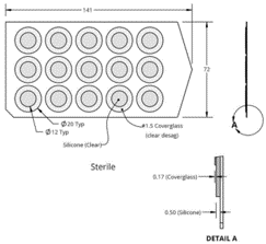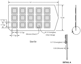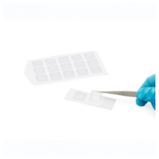 產品由上下兩部分構成:上層是No.1.5厚度的玻璃蓋玻片,下層是0.5mm厚度的透明硅膠片,無菌包裝可直接使用。設計上硅膠片較玻璃片略大,比如蓋玻片12*12mm大小,下方的硅膠片17*17mm大小,產品大小特別適于培養皿和培養板使用。包裝時,背襯底板是透明大塑料板,一板15個,一包有5板(共計75個)。