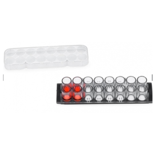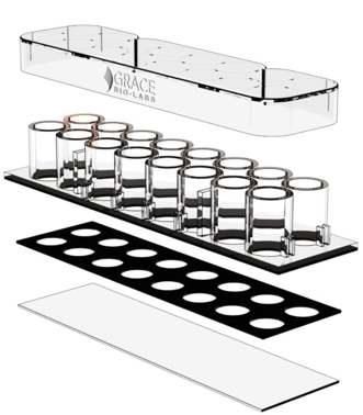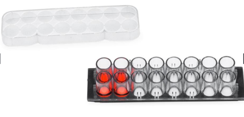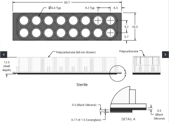 蓋玻片上的腔室共16個,分2排,各8孔(如圖示),每孔的內(nèi)直徑6mm。設(shè)計(jì)的每孔體積和孔距與標(biāo)準(zhǔn)96孔板的相同,無細(xì)胞毒性的硅膠孔墊片(silicone well gasket)與上層聚苯乙烯材料的腔室(the upper structure,厚0.5mm)和基層的硼硅酸鹽蓋玻片(the substructure,厚0.16-.19mm)形成滴水不漏的密封。有上層腔室時每孔體積250µl,去掉上層腔室后每孔體積9µl。