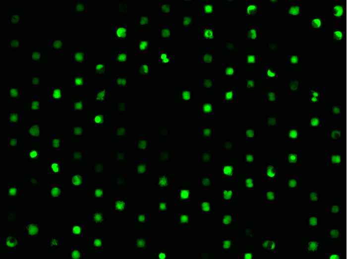 在ibiTreat µ-Pattern (sqr30, pit75)上培養的表達eGFP的Huh7細胞。細胞接種于用層粘連蛋白包被的ibiTreat µ-Pattern表面。圖片由慕尼黑路德維希-馬克西米利安大學的Gerlinde Schwake提供。
