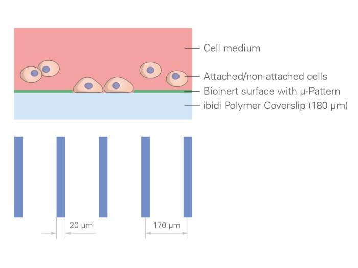 ?載玻片采用ibiTreat微圖案化表面,并由先進(jìn)的 ibidi Bioinert 生物惰性表面包覆