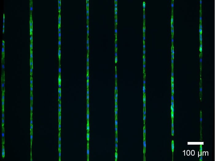 在20 µm lines上培養(yǎng)的人臍靜脈內(nèi)皮細(xì)胞(HUVEC)。細(xì)胞接種前用Matrigel®進(jìn)行預(yù)包被。孵育兩天后,進(jìn)行固定和染色。藍(lán)色:細(xì)胞核(DAPI),綠色:F-肌動蛋白細(xì)胞骨架(Alexa 488偶聯(lián)物),10倍物鏡,寬場熒光成像。