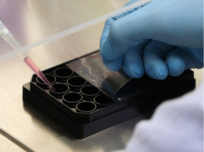 ibiSeal 76x114在μ-Plate 24孔板上。ibiSeal可以很容易地移除以交換液體。